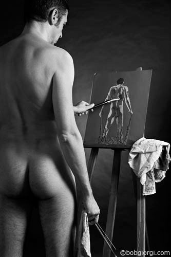 Peintre, réalisant un auto portrait nu